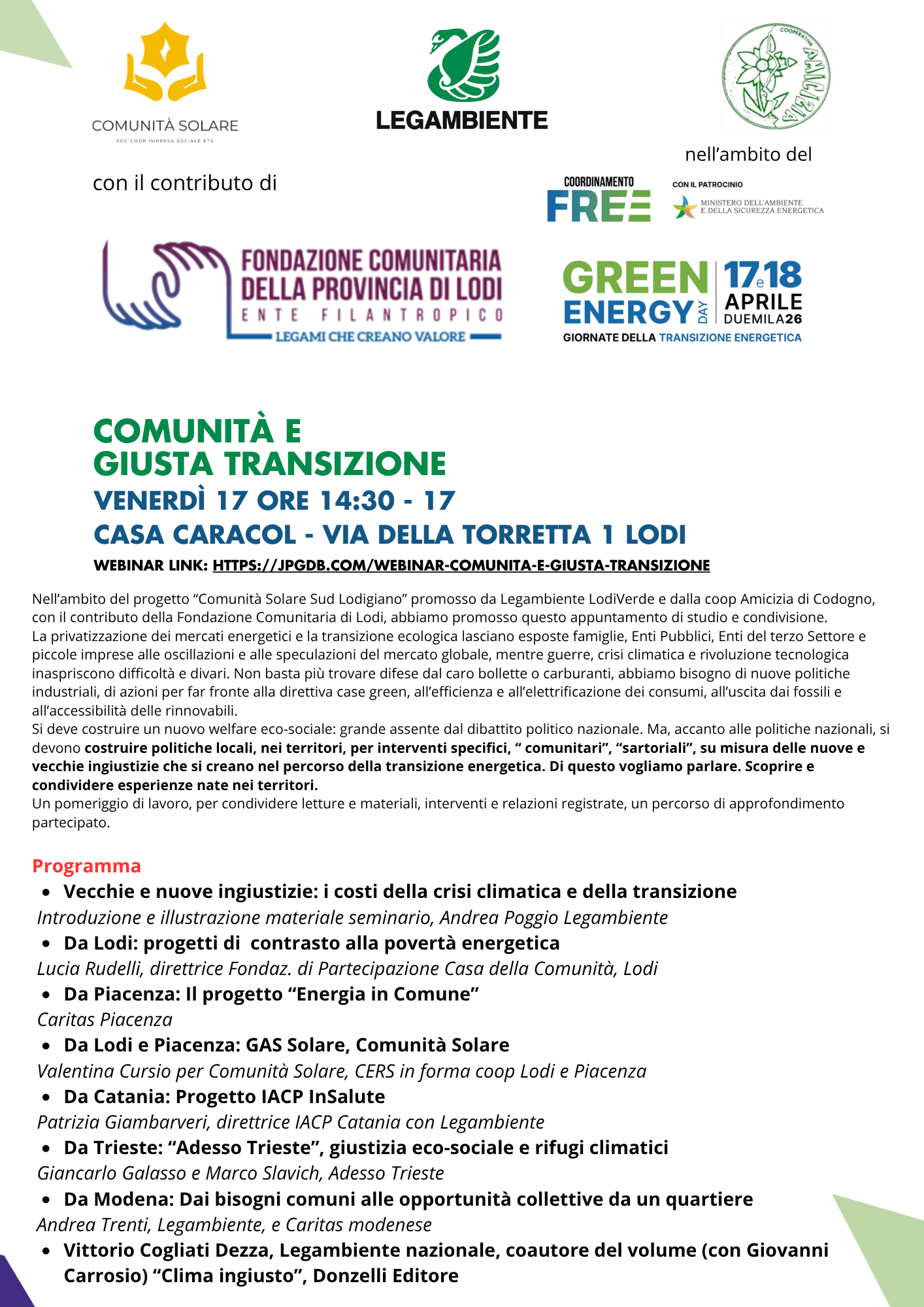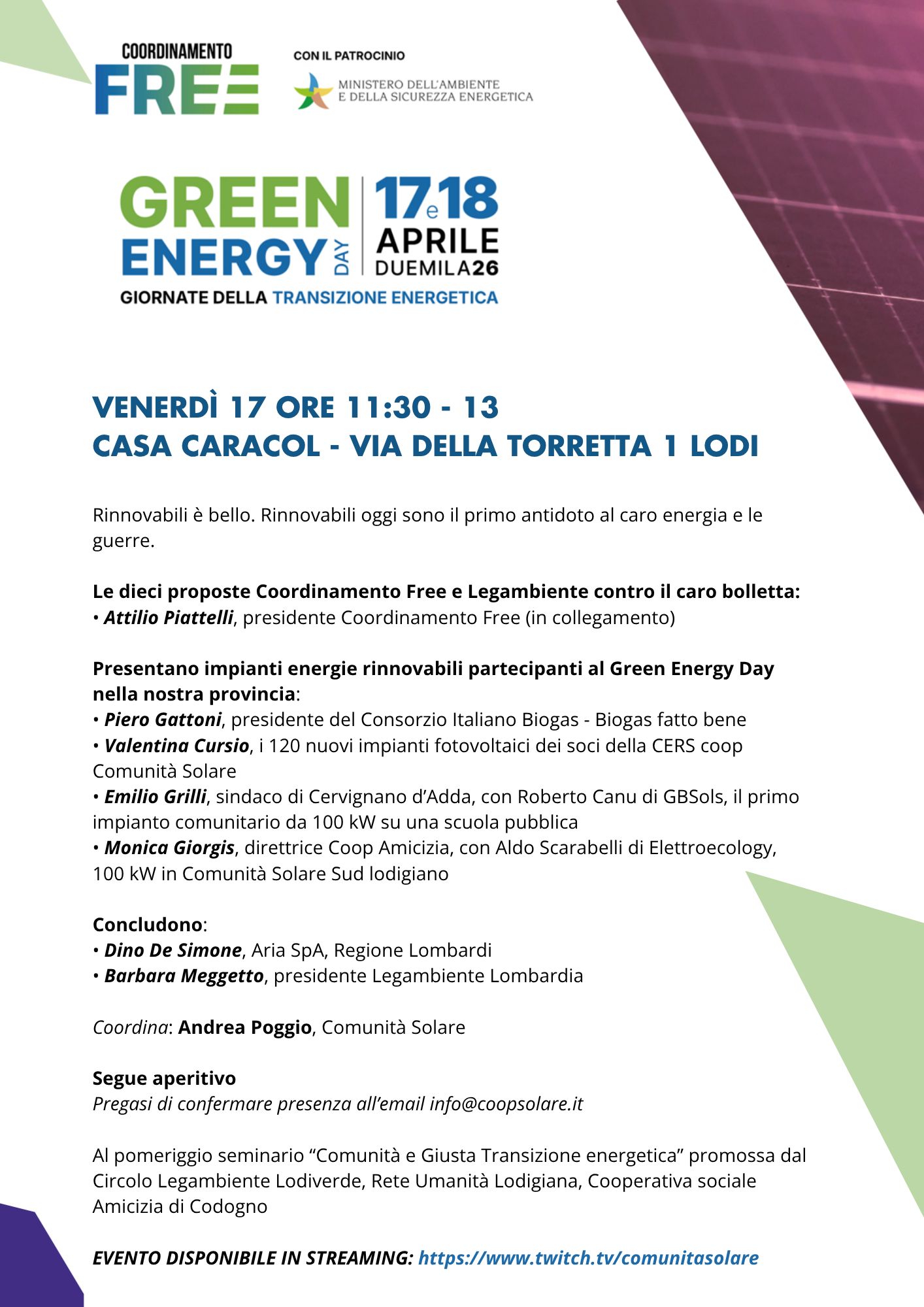 Torna per la sua terza edizione il Green Energy Day, l’evento nazionale dedicato alla transizione energetica, per le rinnovabili e l’efficienza energetica. Quest’anno, l’evento si terrà su due giornate, il 17 e 18 aprile 2026 ed è organizzato dal Coordinamento FREE, in collaborazione con le principali associazioni del settore.